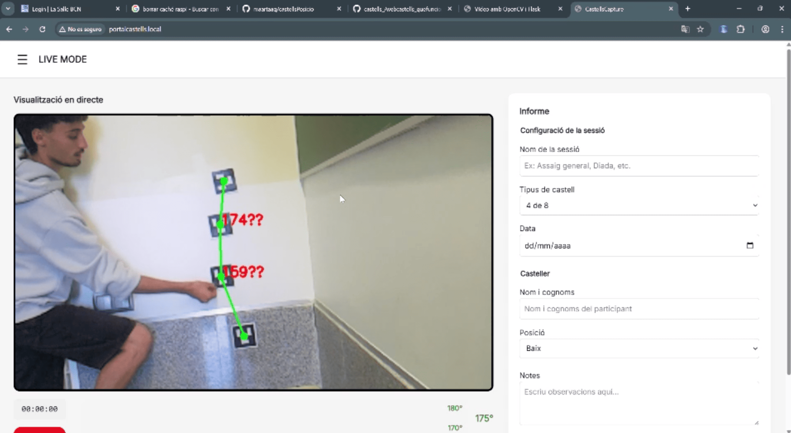 El dispositivo procesa el vídeo in-situ usando algoritmos de Pose Estimation (Mediapipe), extrae las coordenadas vectoriales de los castellers y envía solo los datos procesados a una tablet cliente mediante un servidor Flask local.